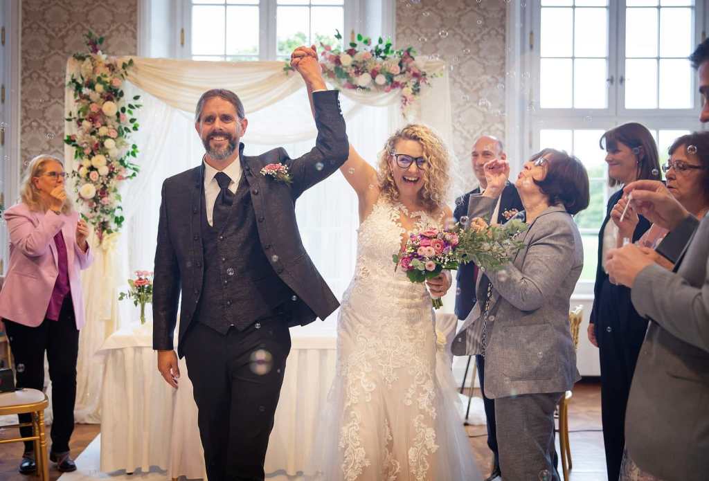 Hier also die Zusammenfassung unserer Traumhochzeit: Herumgerenne, wirres Lachen, Verzweifeln, hysterisches Lachen, Folie, Vasendesaster, Fotos, doch nicht Fotos, zu wenig Fotos, falsche Fotos, beste Freunde, Regen, Sonne, Wolkenbruch, rein, raus (nö, nicht, wie ihr denkt), Seifenblasen, mit Seife, ohne Seife, falsche Sessel, keine Sessel, Dinnertische ohne Tischtücher, Dinnertische doch mit Tischtüchern, Tombolapreise, Wühlkiste, Fotobox, Karaoke für Anfänger, Trauzeugin, Trauzeugin-Assistentin, Trauzeugin, die Trauzeugin-Assistentin sucht, Trauzeugin-Assistentin, die Braut sucht, Torte ohne Blumen, Torte doch mit Blumen, M&Ms für jeden Platz, M&Ms nur für fast alle Plätze, Fotoshow am Bildschirm, Bildschirm, den jemand einschalten hätte müssen, liebliche Zurufe Marke „Verschwinde jetzt endlich!“ in meine Richtung, schminken, doch nicht schminken, später schminken, zuerst andere schminken, Panikattacke, Notfalltropfen, oben ohne, Make-up in Hülle und Fülle, rein ins Kleid, wieder raus aus dem Kleid, posen, zittern, auf die Uhr schauen, noch mehr zittern, heulen, in Reih und Glied, Einzugslied, los geht’s, Rückzieher, doch nicht Rückzieher, fuck, was mach ich da????, oh, da steht er ja, Gott, wie hübsch er aussieht, Glück, Freude, Liebe, was, ich singe wirklich? Kuss, hinsetzen, zuhören, nichts richtig mitbekommen, weinen, noch mehr weinen, alle weinen, lachen, freuen, zittern, festhalten, Kinder umarmen, Ja sagen, schmusen, pures Glück, Seifenblasen, Jubel, Auszug, wir haben’s getan!!!!, es regnet ja gar nicht, ab zum Fotoshooting, Drohne überm Kopf, Lächeln im Gesicht, Regentropfen, blauer Himmel, schmusen, schmusen, noch mehr schmusen, Weberknecht im Kleid, Freude in den Augen, Hunger, Zeitcheck, zurück zur Location, lautstarker Empfang der Gäste, Akkordknuddeln und Fotobeweise, herzen, umarmen, freuen, glücklich sein, kurz was mampfen, Brautstrauß werfen, ab in den Saal, hopsende Gäste am Weg zum Buffet, lachen, plaudern, wohlfühlen, Emotionen, Glück, Ansprachen, Fotobox, Karikaturist, Gemälde, genießen, tanzen, herumwirbeln, Karaoke singen, Freunde wiedersehen, Mann suchen, Mann suchen, Mann suchen (x100), wiederfinden, Hochzeitstanz, tanzende Kinder mit Sonnenbrillen, volle Tanzfläche, glückliche Gäste, Mann unterm Kleid, Lichterketten vor dem Fenster, Strahlen in den Augen, feiern, lachen, plaudern, genießen, nicht glauben können, großartig finden, Abschied nehmen, Erinnerungen festhalten, ins Bett fallen, überwältigt einschlafen, als Ehefrau aufwachen… vollends glücklich sein.